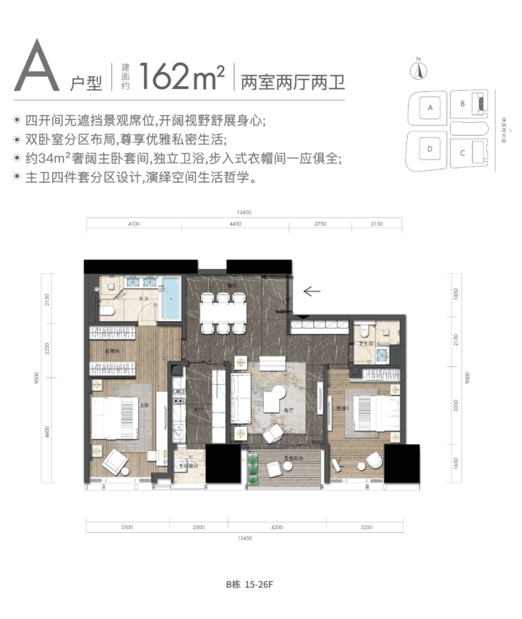如:最低门槛户型1房为62-72平,2房户型为162/164平;