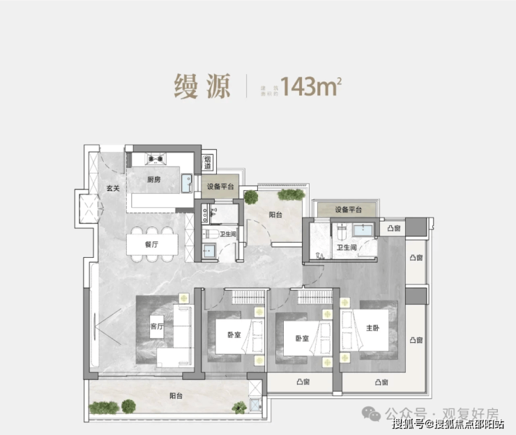 (新规下超高使用率,80cm飘窗、阳台“偷面积”设计,105平3+x户型,“全周期可进化”。)