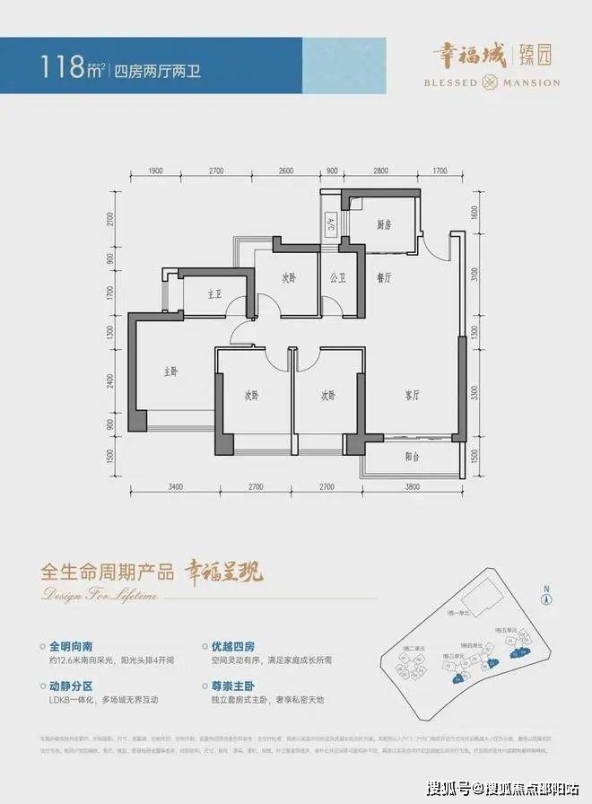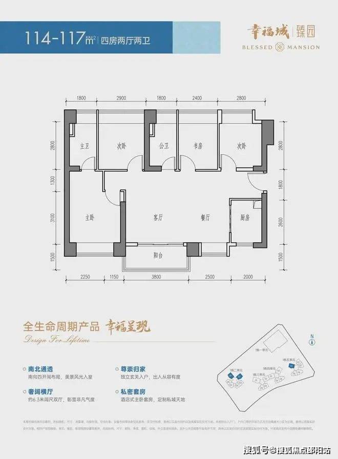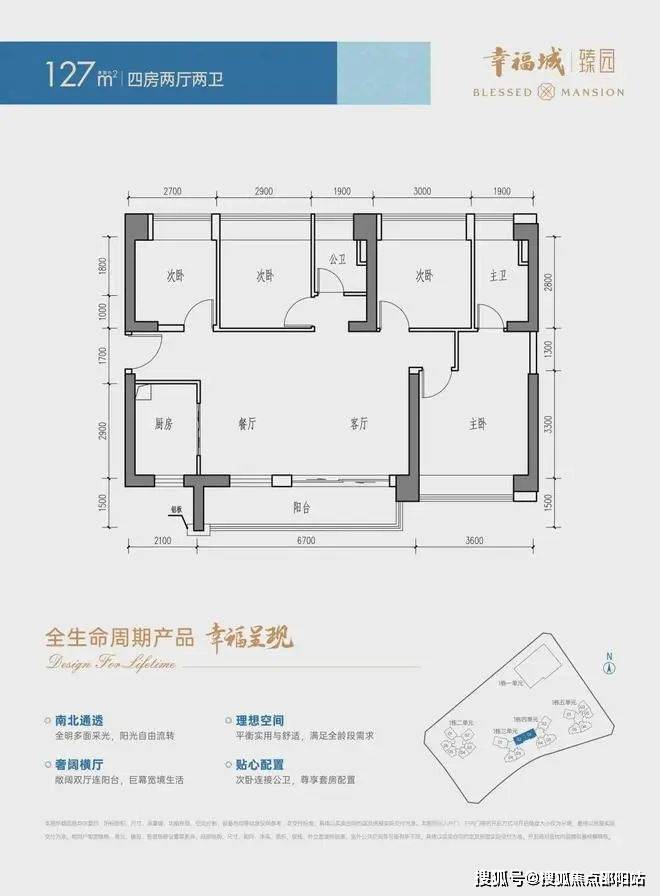 横厅南北通透,6.3米客餐厅,8飘窗,得房率84.87-87.1%,主朝西南/东南。