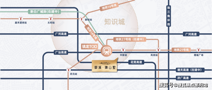 镇龙TOD作为重要的交通枢纽,连接了“3地铁+1城轨+5高速”的超级路网,进一步提升了项目的通达性。而新白广城轨的开通,则使得从知识城到白云机场只需3站,穗莞深城际更是直达深圳机场,大大缩短了大湾区内的出行时间。