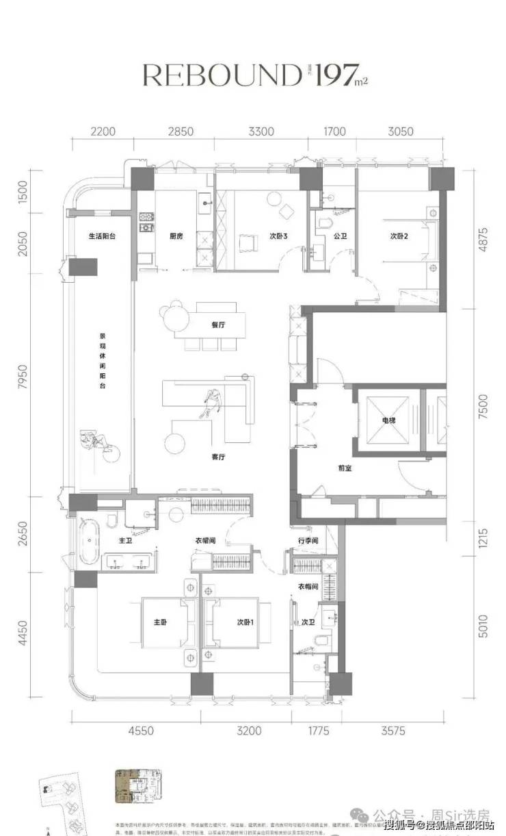 建面约197㎡户型,含电梯厅综合赠送后使用率可达93-95%。