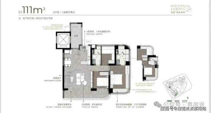 111m²三房两厅两卫的D户型:竖厅格局,得房率约92-100%(含赠送),朝向为西南或东南。