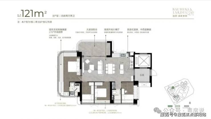 121m²四房两厅两卫的B户型:采用横厅南北通透格局,得房率约92-100%(含赠送),阳台主要朝向西南或东南。