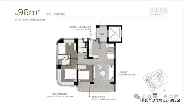 96m²三房两厅两卫的E户型:竖厅格局,拥有超宽客厅,LDKB一体化设计,动静分区。三开间朝南,得房率高达92-100%(含赠送部分)