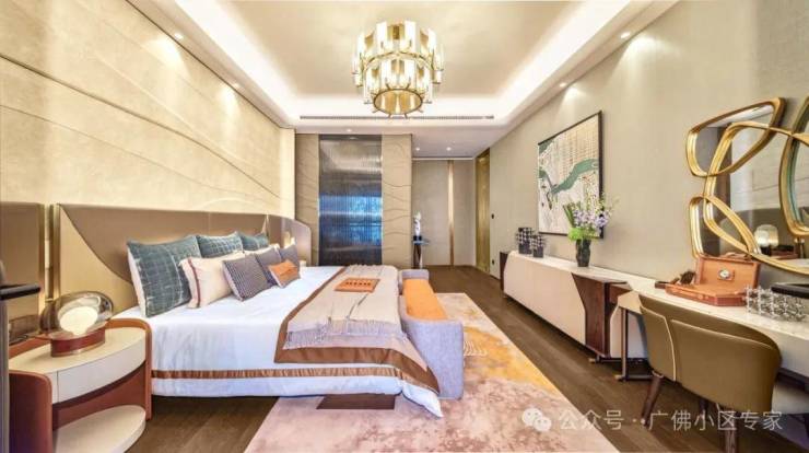 ✨主卧墙面采取驼色扪皮搭配玫瑰金不锈钢收边;