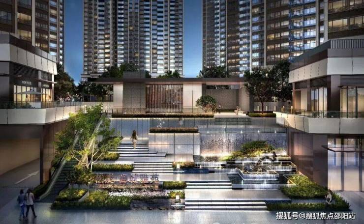 【高台阔府 水韵门庭】入口处叠水流瀑搭配罗汉松,高台轩昂门庭彰显尊荣威仪,于步步高升中体验归家的荣耀。