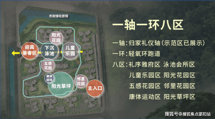 巨资打造都市森邻·公园主题园林,以建筑环绕园林空间的规划理念,在功能上规划打造“一轴”“一环”“八区”三大功能体系。