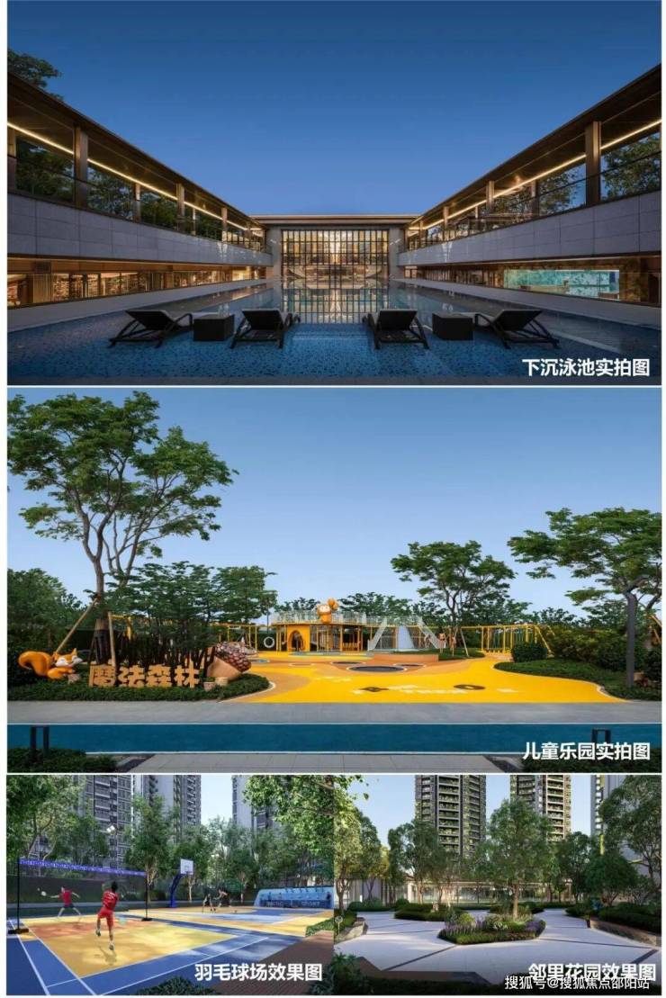 涵盖片区首创下沉泳池、5000㎡阳光草坪、1500㎡魔法森林儿童乐园、国标级羽毛球场、篮球场、邻里花园等全龄休闲功能,实现自然与健康融合的森居大境。