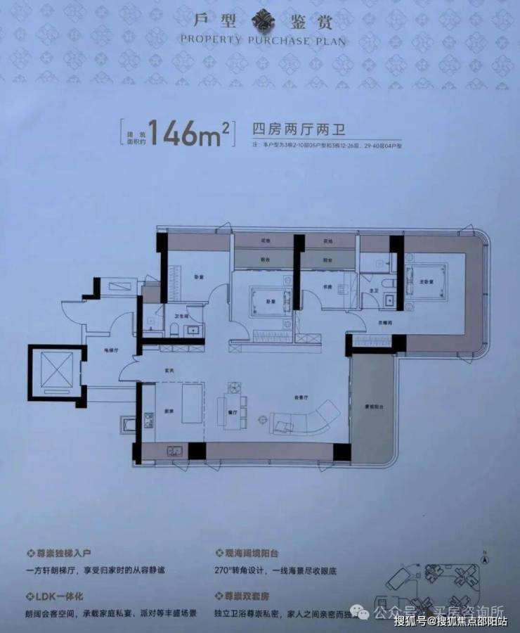 总占地面积约1.58万㎡,总建筑面积约14.1万㎡,计容建筑面积约10.44万㎡,容积率6.54,绿化率40.01%,共由4栋31-45层高住宅组成,4梯5户(低区)/4梯4户(高区)、约125㎡以上专梯专户