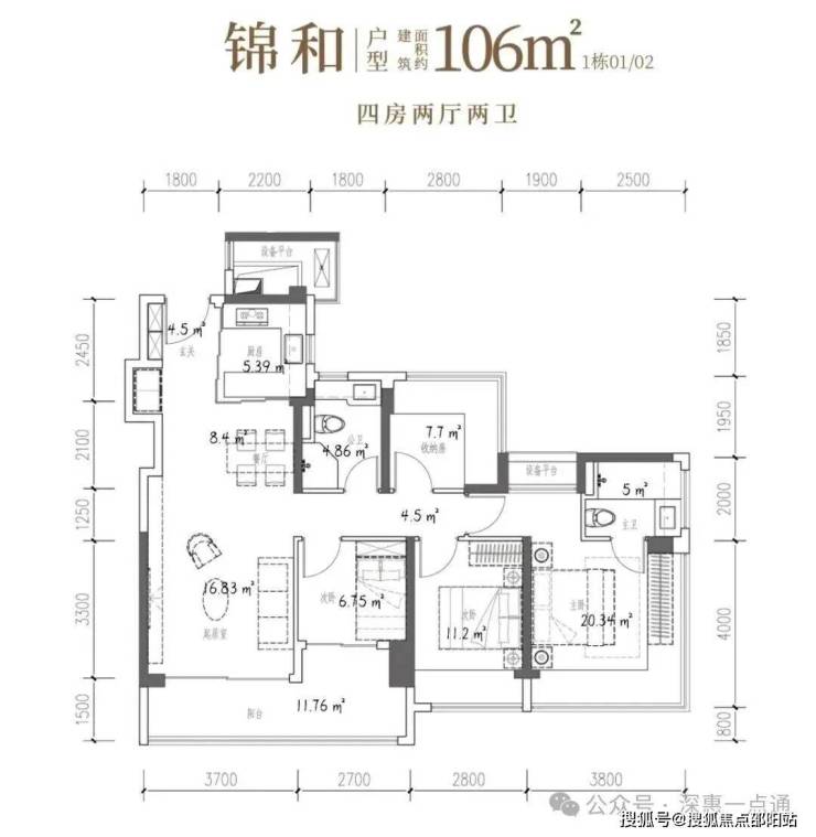 106㎡的4房2厅2卫,设计的是竖厅格局,客厅3.7米开间,LDKB一体化,S墙设计预留冰箱卡槽位,四开间朝南,动静分区,主卧270°无柱转角飘窗还带1个设备平台约1.52平,分别做到了主卧20.34㎡/次卧11.2㎡/次卧7.7㎡/次卧6.75㎡(包含墙体飘窗),U型厨房烟道外置,卫生间干湿分离,得房率约101.16%(包含赠送),客厅连接次卧出大阳台约11.76平,东南朝向。
