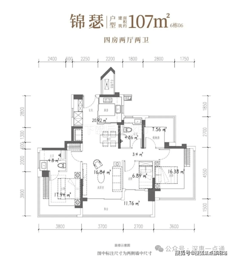 107㎡的4房2厅2卫,设计的是竖厅双龙抱珠格局,客厅3.7米开间,LDKB一体化设计,预留冰箱卡槽位,四开间朝南,主卧+2个次卧270°无柱转角飘窗,分别做到了主卧17.94㎡/次卧16.38㎡/次卧7.56㎡/次卧6.89㎡(包含墙体飘窗),U型厨房烟道外置,卫生间干湿分离,得房率约104.06%(包含赠送),客厅连接次卧出超大阳台约11.76平,东北朝向。