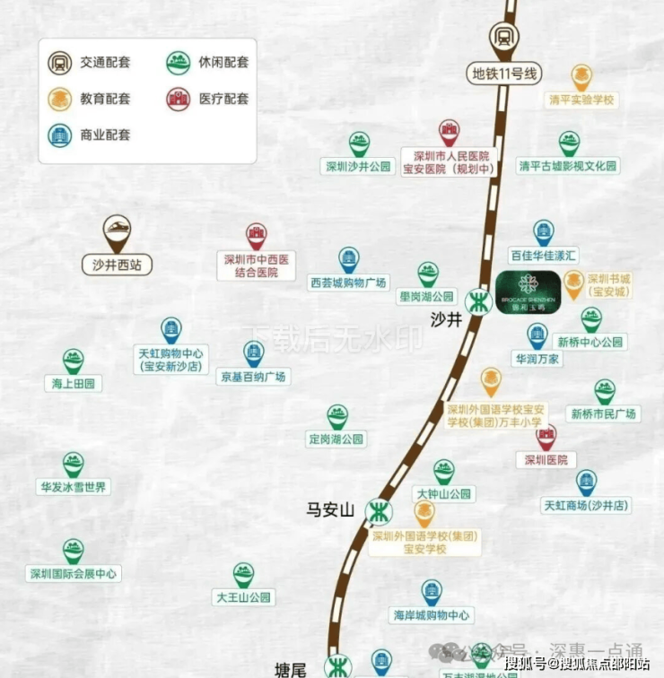 锦和玉鸣府距离地铁11号线沙井站C、D出口仅约400米,步行约7分钟可达。从沙井站出发,2站可到达机场东站换乘1号线,8站到宝中,10站到前海,15站到南山高新园,通勤效率极高。地铁11号线运营时间为6:12-23:00,高峰时段行车间隔4分钟,平峰时段8分钟,满足居民日常出行需求。项目周边公交线路丰富,如M351路可直达地铁12号线怀德站,全程约25分钟,为不常乘坐地铁的居民提供了更多选择。