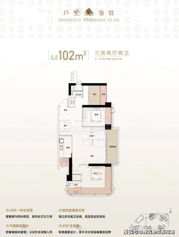 102㎡的3房2厅2卫,设计的是竖厅格局,LDK一体化设计,四开间朝南,主卧270°全景舱,L型厨房,公卫三段式干湿分离,得房率约94%(包含赠送),东南朝向看海景视野。
