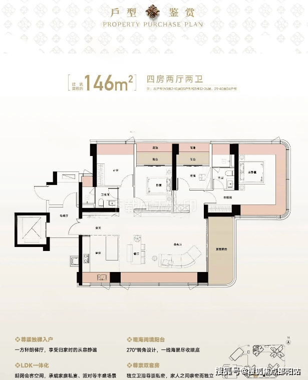146㎡的4房2厅2卫,设计的是竖厅格局,尊享独立电梯入户,LDKB一体化设计,动静分区,主卧270°无柱转角全景舱,L型厨房+岛台设计,卫生间干湿分离,得房率约105%(包含赠送),东南朝向看海景景观。