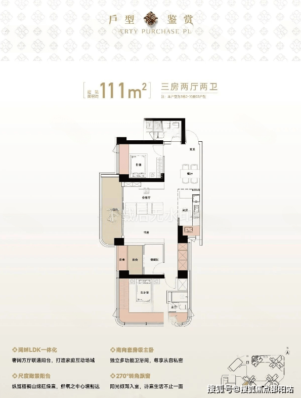 111㎡的3房2厅2卫,设计的是竖厅格局,LDK一体化设计,四开间朝南,主卧270°无柱转角全景舱,L型厨房,卫生间干湿分离,得房率约94%(包含赠送),西北朝向看一线梧桐山景观。