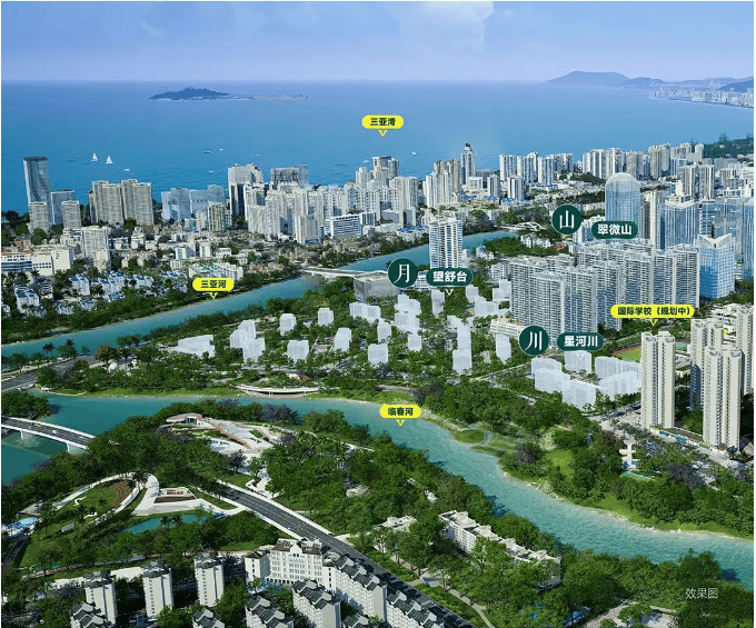 · 自然资源:三亚河、临春河双河环绕,毗邻金鸡岭公园、临春岭森林公园,山脉起伏、绿脉渗透,彰显东方艺术审美“山-城-河”的对话关系。