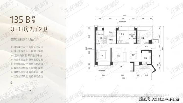 135㎡的4房2厅2卫,B户型(2栋4单元06户型),设计的是横厅南北通透格局,进门入户玄关,客餐厅7.2米开间,LDKB一体化设计,四开间朝南,4个卧室分别做到了主卧19.08㎡/次卧14.3㎡/次卧11.7㎡/次卧11.7㎡(包含墙体飘窗),客厅连接次卧出6.8米长的观景大阳台看深大校区,U型厨房,卫生间干湿分离,得房率约90%(包含赠送),阳台主朝西南向。