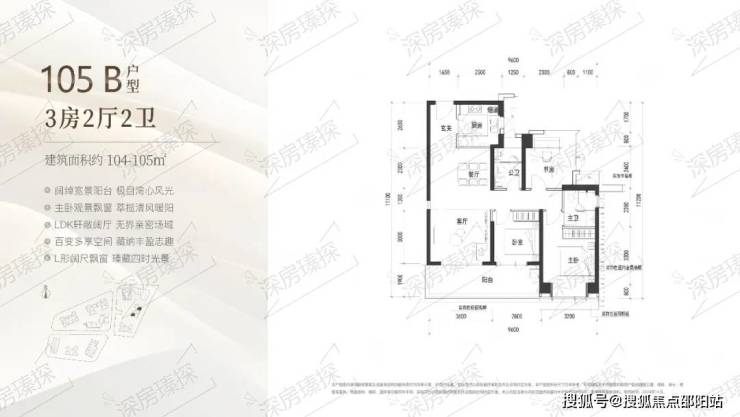 105㎡的3房2厅2卫,B户型(2栋3单元02/06户型),设计的是经典竖厅格局,客厅3.6米开间,LDKB一体化设计,三开间朝南,动静分区,3个卧室分别做到了主卧13.12㎡/次卧9.9㎡/次卧8.4㎡(包含墙体飘窗),客厅连接次卧出6.4米长的宽景大阳台,U型厨房,卫生间干湿分离,得房率约90%(包含赠送),正南或东南朝向。