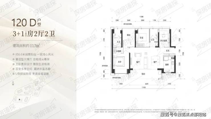 117㎡的4房2厅2卫,D户型(3栋2单元06户型),设计的是横厅南北通透格局,客餐厅6.6米开间,四开间朝南,4个卧室分别做到了主卧17.35㎡/次卧9.8㎡/次卧9.1㎡/次卧8.05㎡(包含墙体飘窗),客餐厅出6.6米长的宽景大阳台,U型厨房,公卫三段式分离,得房率约90%(包含赠送),西南朝向。