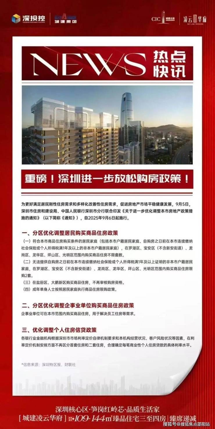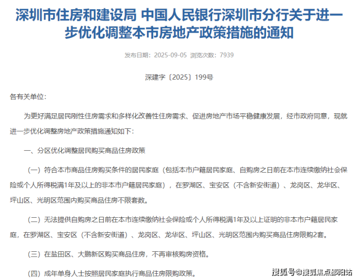 深圳市住房和建设局与中国人民银行深圳市分行于2025年9月5日联合发布了《关于进一步优化调整深圳市房地产政策措施的通知》,该政策自2025年9月6日起正式施行。此次新政主要包含三方面调整: