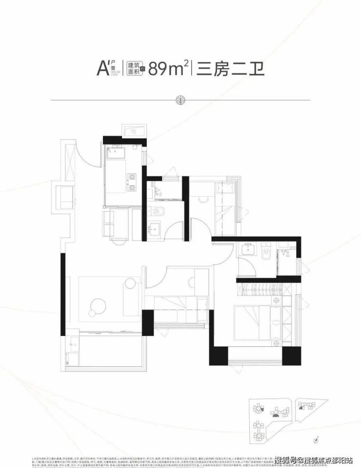 89平米三房两卫户型,阳台为东北朝向,卧室客厅是东北-西南通透,价格在227-243万左右,