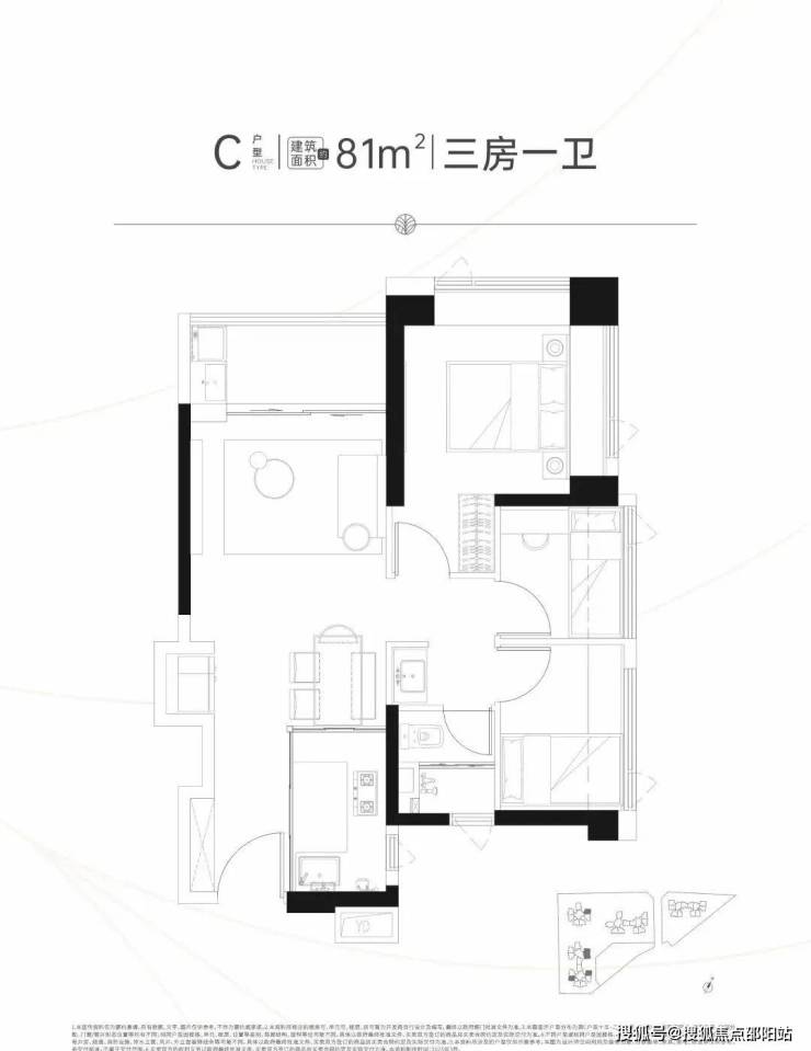 81平米三房一卫户型,为西南朝向,总价区间在203万至217万左右,