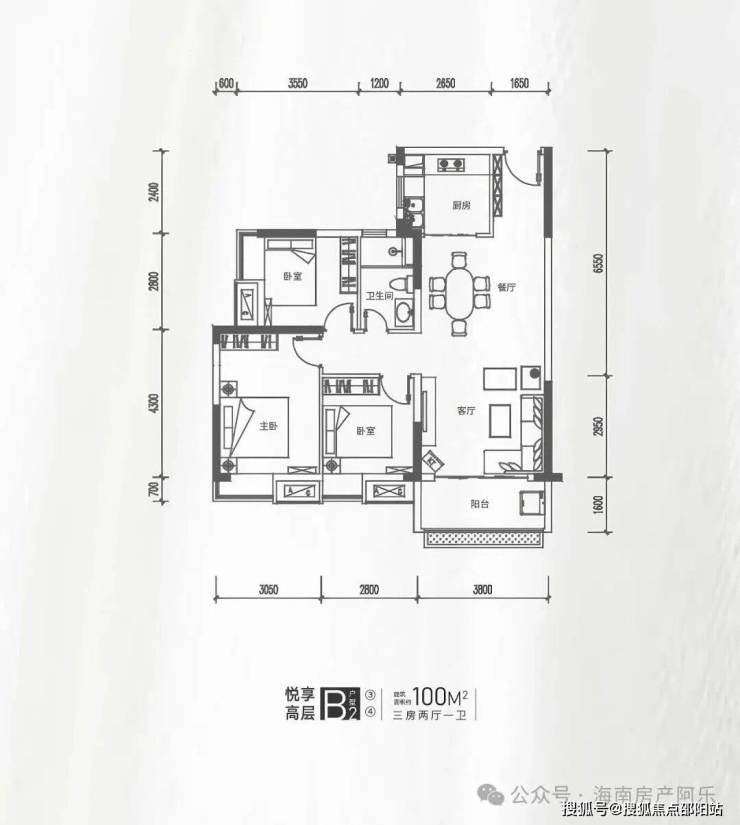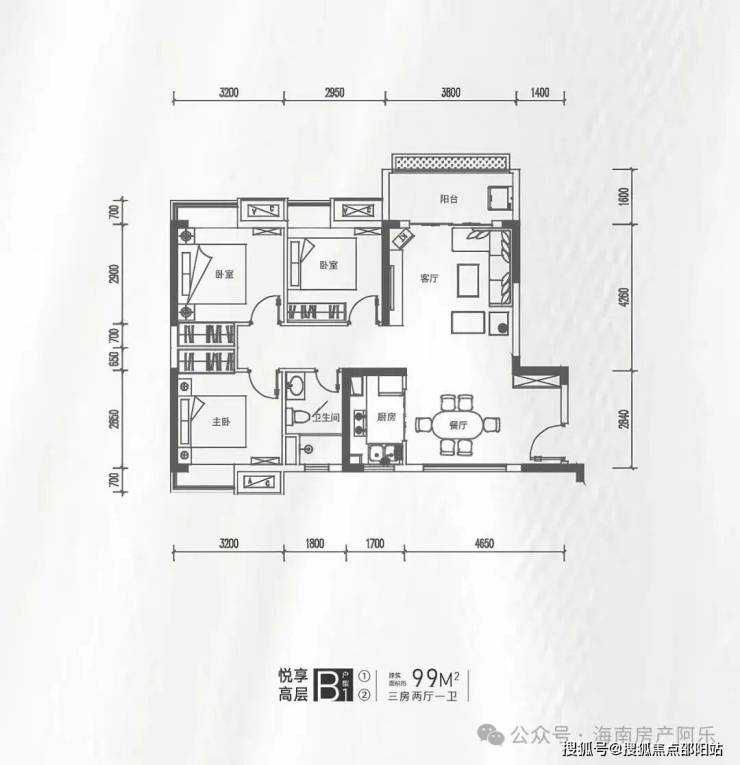 三房两厅一卫,户型方正