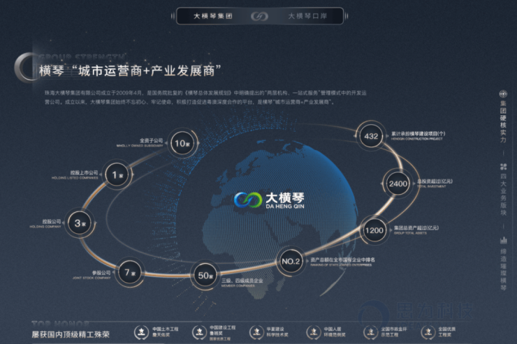 珠海大横琴集团有限公司(简称大横琴集团或集团)是珠海市国资委于2009年4月成立的直属国有企业。成立以来,大横琴集团坚守促进澳门经济适度多元发展的初心使命,是珠海国资国企践行粤澳深度合作的重要载体和骨干力量。截至目前,大横琴集团总资产超2600亿元,累计开发建设项目487个,拥有全资子公司12家、控股上市公司2家、控股公司2家、参股公司11家以及三级、四级成员企业63家。