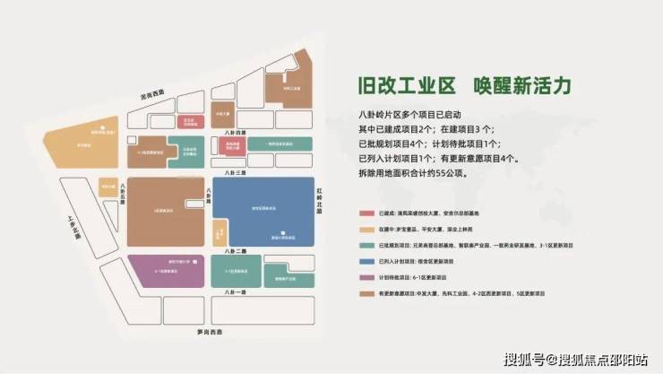 八卦岭片区多个项目已启动,其中已建成项目2个,在建项目3个,已批规划项目4个,列入计划项目1个,计划待批项目1个,有更新意愿项目4个。拆除用地面积合计约55公顷。