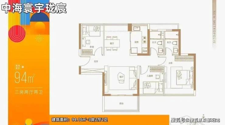 94㎡的3房2厅2卫(07户型),设计的是竖厅南北通透格局,客厅3.7米开间,三开间朝南,全屋飘窗设计,U型厨房,得房率:90.35%(包含赠送),阳台主朝东南向。