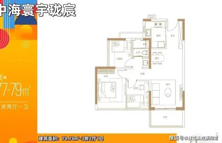 79㎡的3房2厅1卫,设计的是经典竖厅格局,动静分区,客厅3.3米开间,餐客厅一体化,U型厨房,卫生间三段式分离设计,得房率:88.44%(包含赠送),有西南、东南、西北朝向。