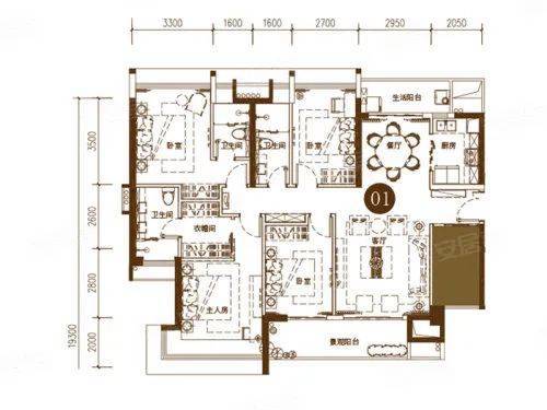 洋房户型;3室2厅2卫1厨, 建筑面积约98平米