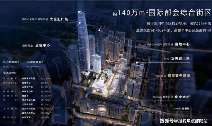 深圳中心天元项目占地面积约22.3万㎡,总建筑面积约140万㎡。规划有约21万平住宅及公寓、约17万平2栋甲级写字楼、约29万平商业。高端商业—“One Avenue卓悦中心”、170米高的写字楼—高金地中心,目前都已投入使用。