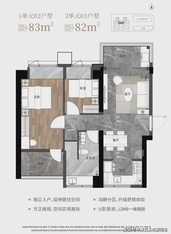 1栋1单元02户型/1栋2单元01户型,竖厅南北通透格局,独立入户,客厅3.2米开间,LDKB一体化设计,动静分区,南北双阳台,U型厨房,卫生间干湿分离,阳台正北朝向。