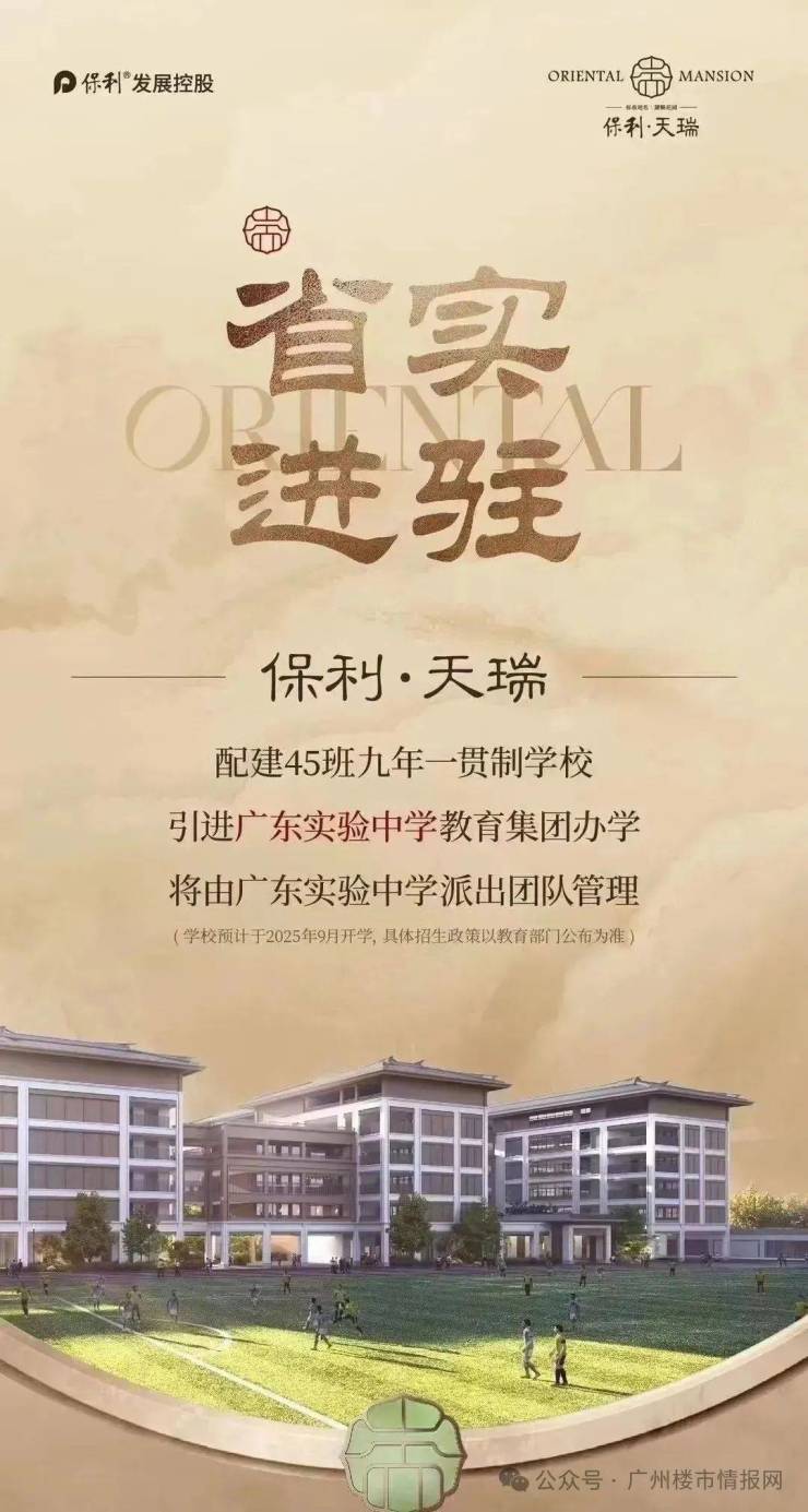 保利天瑞项目配建的45班九年一贯制学校(学校预计2025年9月开学,具体招生政策以当年教育部门公布为准),由广东实验中学教育集团直管运营,是天河首个引入省属名校的公办教育配套。在2024年的中考中,就以735分的录取分数线,力压全市99%的学校。在广州是站在第一梯队的顶端。