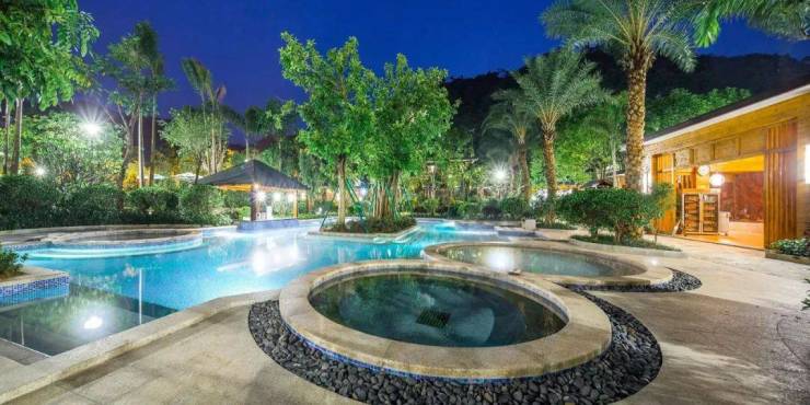 在山林间打造32个含氡温泉,日出水量达到1000多立方,出水温度36℃至40℃,水中还含有稀有的氡元素;