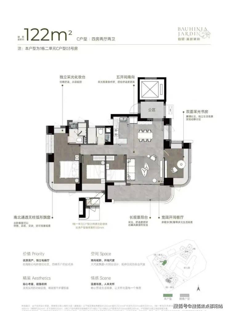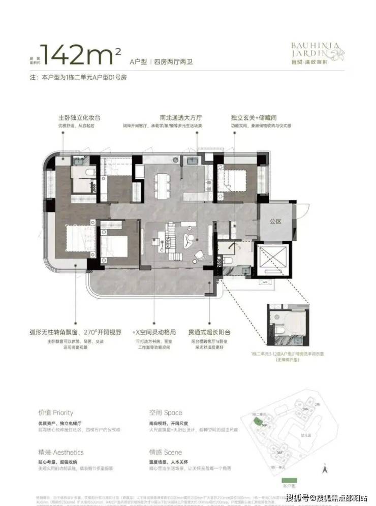 主推约96㎡稀缺三房、111㎡3+1房、122㎡四房、142㎡四房。户型设计了大客厅、宽景阳台、阔景飘窗等,拥有山海河多重景观资源,计划品质精装交付。户型采用建筑新规设计,户户大阳台,4梯5户,分布式电梯设计,独立电梯厅。