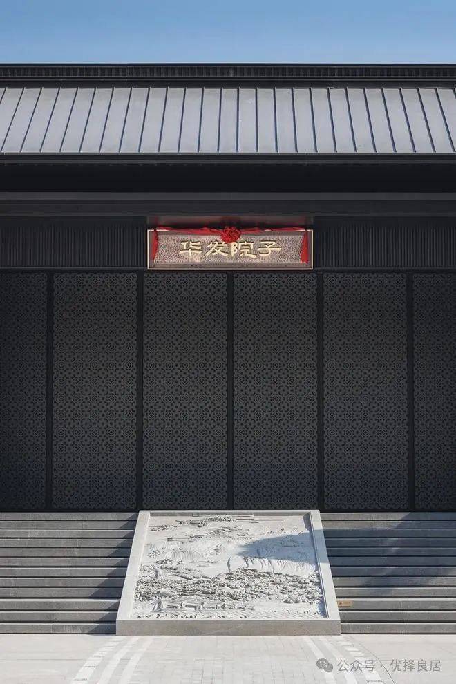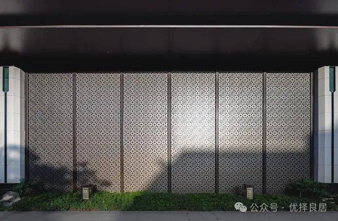 当然,中国传统大门是木制的,屋顶以瓦覆盖,耐用性较差。华发院子门楼屋顶采用铝镁合金板材,通过现代工艺呈现传统建筑韵味。大门展开,细腻窗花和格栅组成的重重屏风,暖光斑驳,更像是一面玫瑰金的不锈钢影壁,与前方两侧香槟金不锈钢格栅围合成一个入户大堂,在保留了门的威严之余,更为符合现代化审美以及实用性。