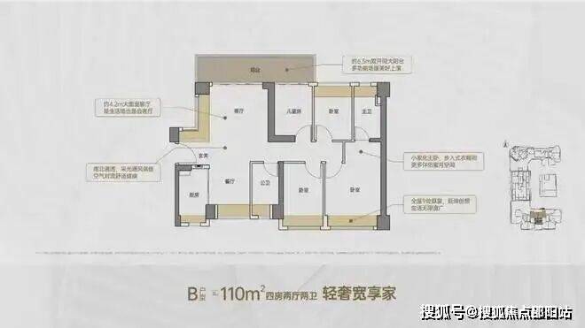 110㎡的4房2厅2卫,设计的是竖厅南北通透格局,客厅4.2米开间,进门户玄关,客厅连接次卧出6.5米长的大阳台,主卧大套间设计,全屋9处飘窗,U型厨房,卫生间干湿分离,阳台主朝北向。