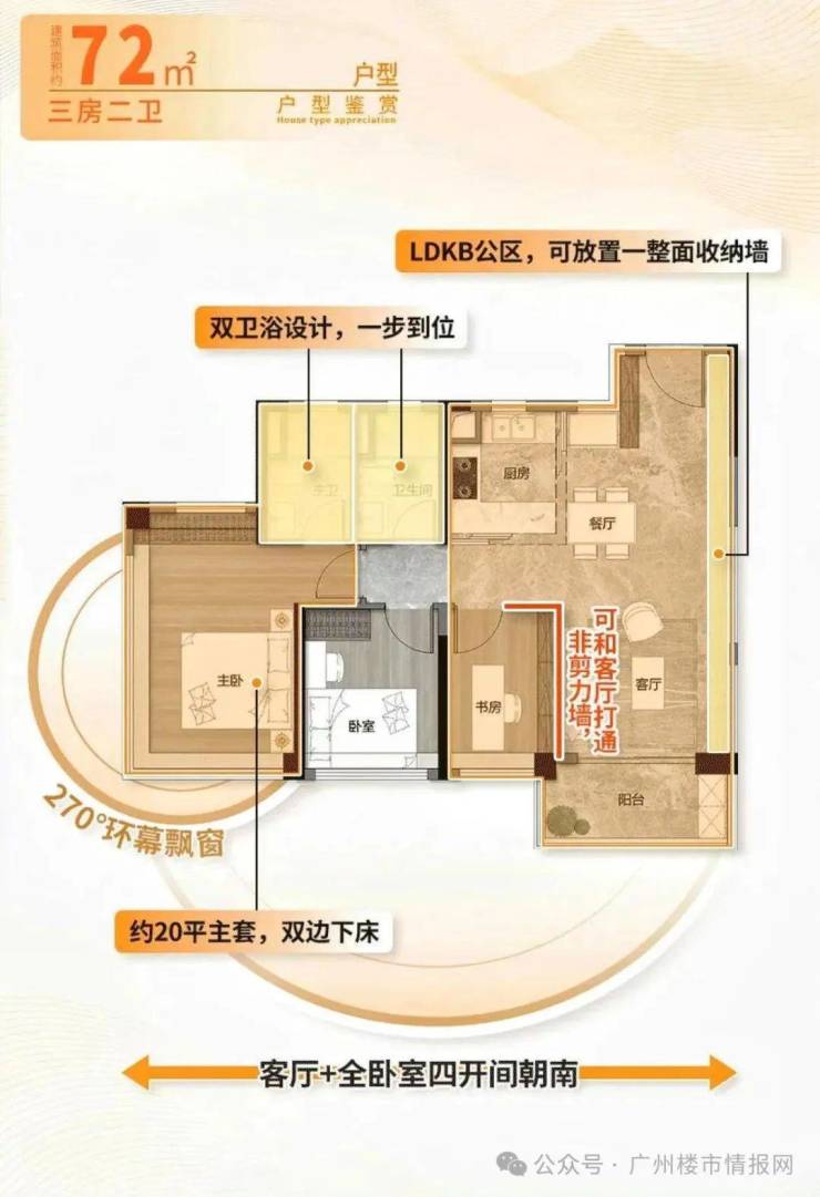 72㎡就做到三房两卫,四开间全南向,玄关位置可打造收纳柜,主卧是套房设计,带L型超大飘窗。