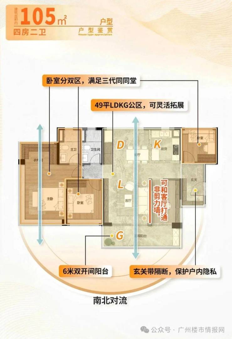 105㎡四房两卫,带入户花园,餐厅有飘窗,可与客厅、阳台形成南北对流。