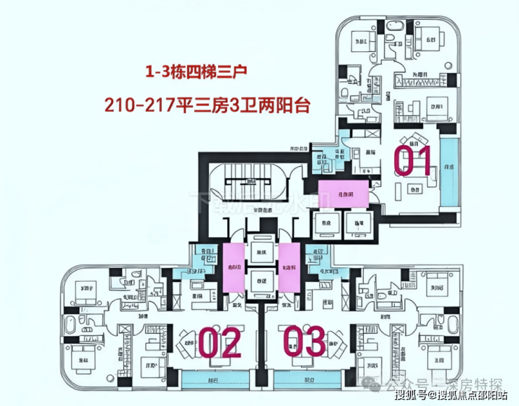 每户都是专梯入户+入户空间。C栋位于小区最里面,东南向户型(218㎡01)会被A、B栋遮挡。