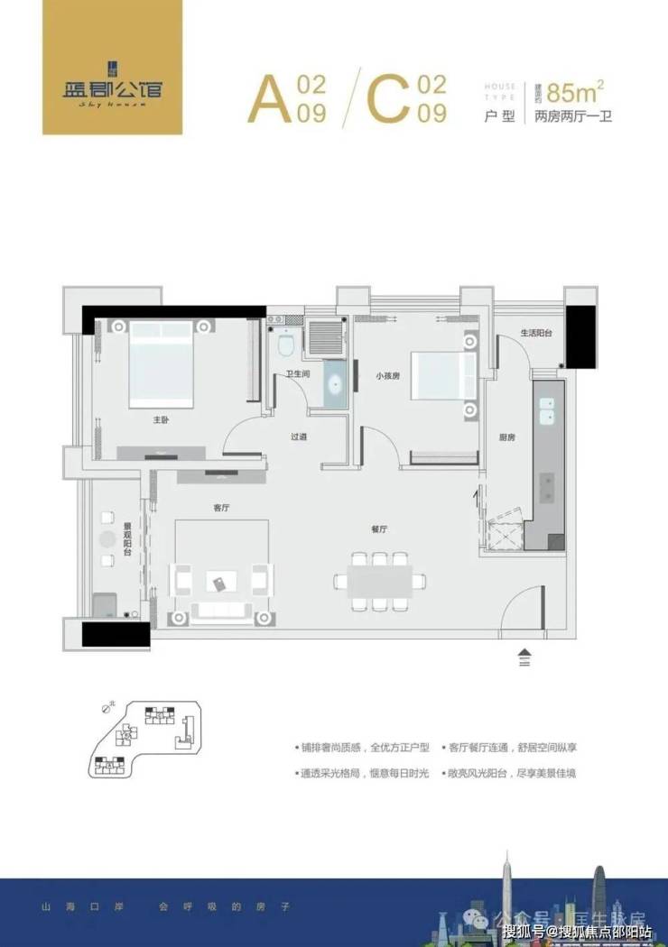 主宾分区,动静分区;端头户型,双面采光;双阳台设置,客厅紧连景观阳台,可观山海。