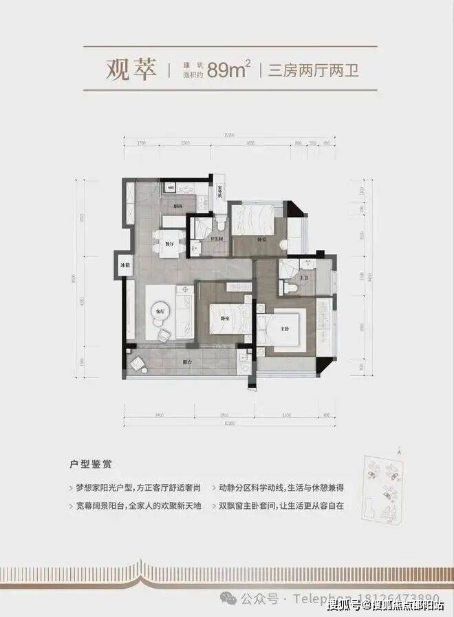 建面约89㎡的三房两厅两卫,竟然做到了带6.3m超级大阳台!三个房间也比市面上89㎡的户型要大。