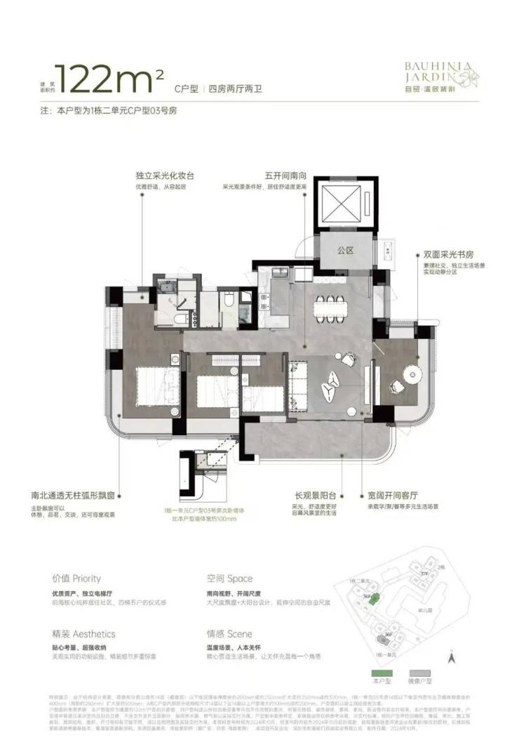 双龙抱珠户型,书房分布于客厅另一侧,且难得是双面采光+270°景观视野。主卧南北通透,且拥有十分开阔的景观面。贯通式阳台联通客厅以及靠近动区的次卧,实现长观景阳台