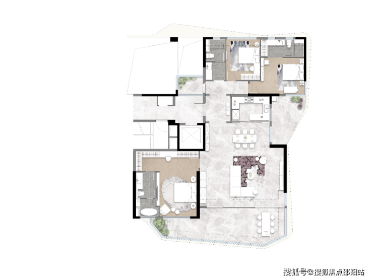 这个户型为3+1,3卫双套房设计。