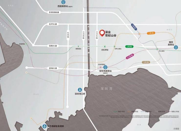 深业世纪山谷位于深圳湾、大沙河生态长廊、高尔夫果岭等五重自然景观交织层叠之间;居于此,可近看约200万㎡果岭景观带、双高尔夫头排盛景,亦可远眺深圳湾一线海景。