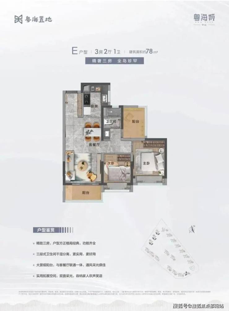 E户型:建面约78m² 3房2厅1卫