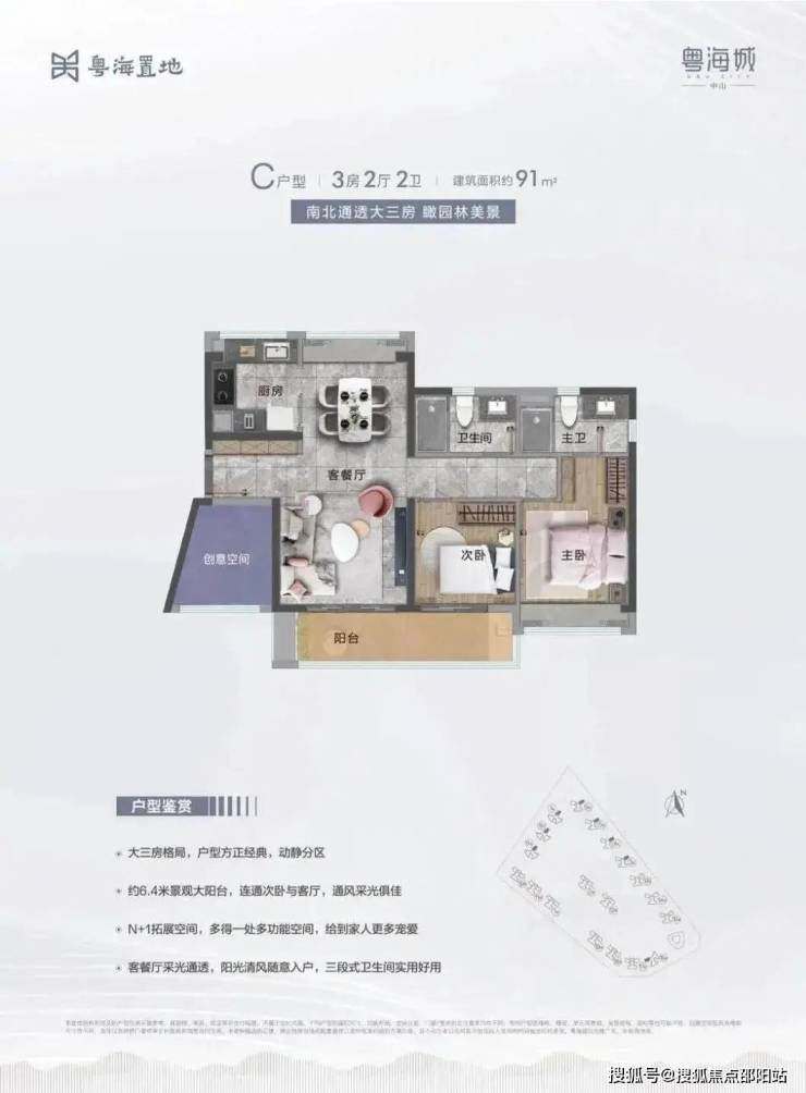 C户型:建面约91m² 3房2厅2卫
