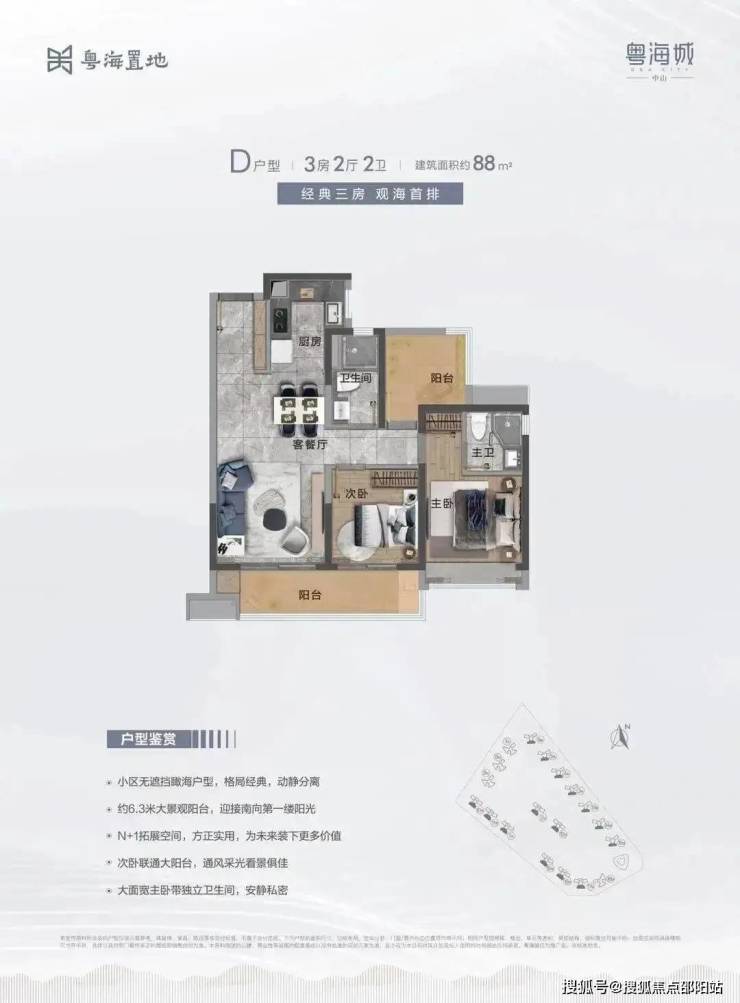 D户型:建面约88m² 3房2厅2卫